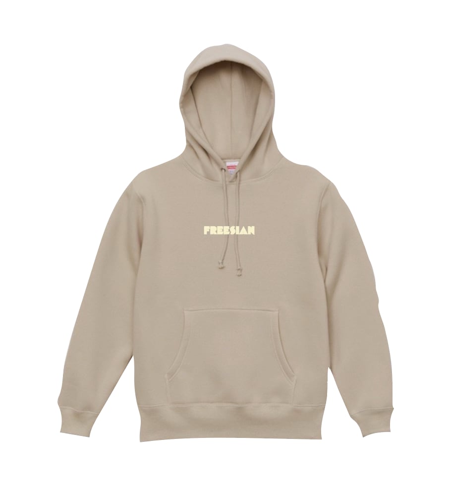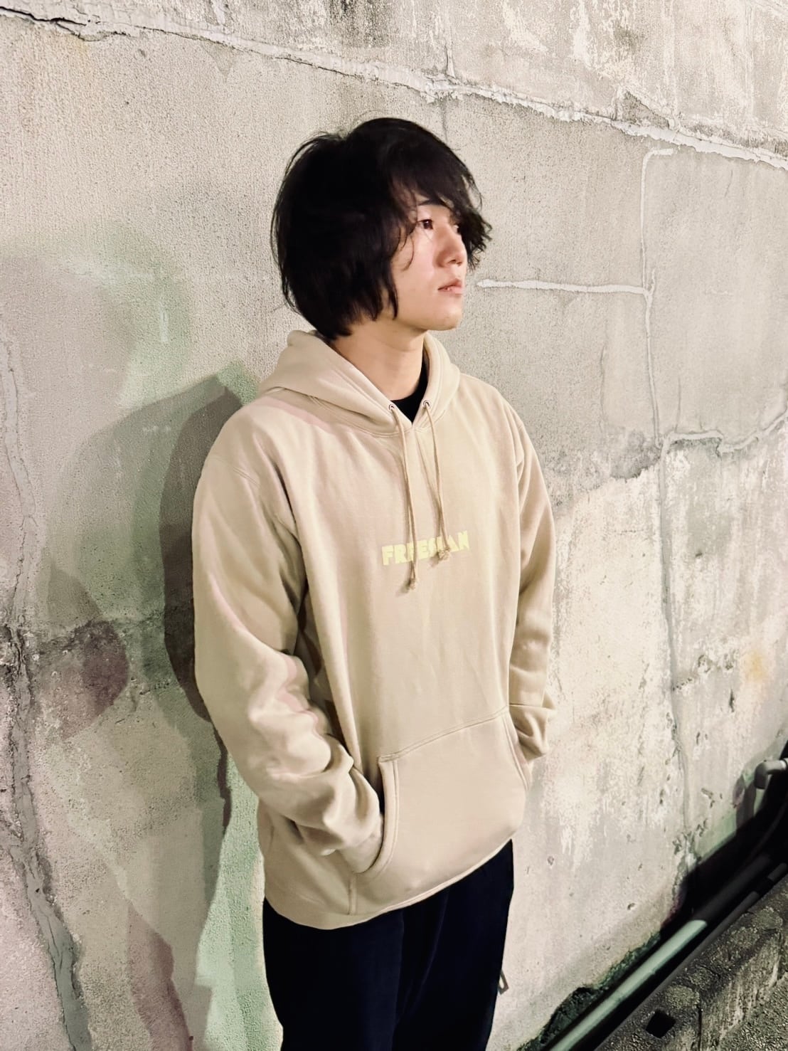 サンドベージュカラーのロゴフーディーです。パーカーです。